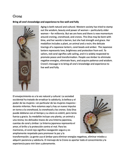 These Divine Divas honor shamans, goddesses and historical women. Their stories distill facets of ancient women’s wisdom, offering knowledge, insights and the power to promote healing today. The Divine Divas are an alchemy of objects—feathers, crystals, gems, seeds, metal, beads and more. The process unfolds spontaneously, starting with the medallions and moving to form the sculpture based on metals at hand. Making these Divas is spontaneous, meditative and always joyful. I hope you find the beauty and the wisdom of these Divine Divas enriching.